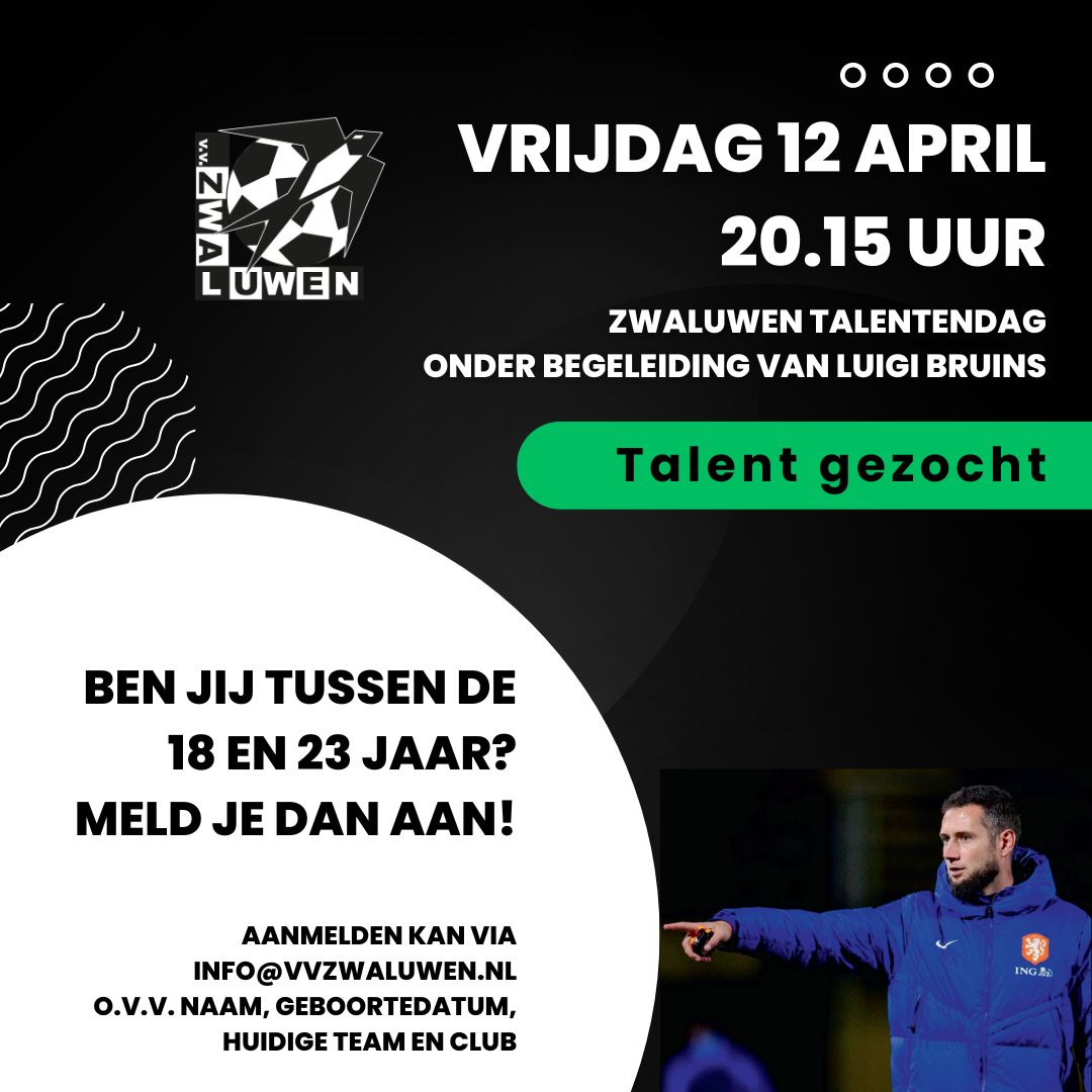 Op vrijdag 12 april om 20.15 uur organiseert Zwaluwen Vlaardingen een talentendag voor spelers onder de 23 jaar. Niemand minder dan Luigi Bruins zal samen met de technische commissie van de 4e divisionist op zoek gaan naar de grootste talenten uit de buurt.