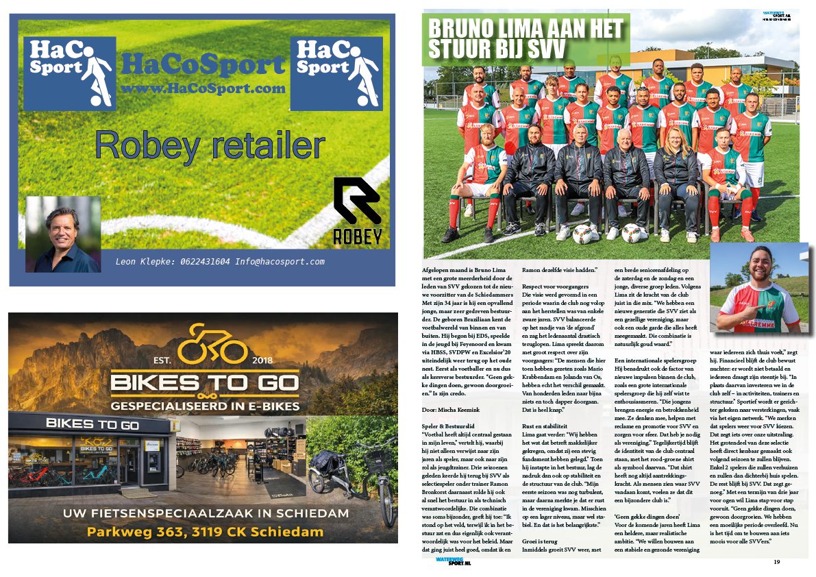 Afgelopen maand is Bruno Lima met een grote meerderheid door de leden van SVV gekozen tot de nieuwe voorzitter van de Schiedammers Met zijn 34 jaar is hij een opvallend jonge, maar zeer gedreven bestuurder. De geboren Braziliaan kent de voetbalwereld van binnen en van buiten. Hij begon bij EDS, speelde in de jeugd bij Feyenoord en kwam via HBSS, SVDPW en Excelsior’20 uiteindelijk weer terug op het oude nest. Eerst als voetballer en nu dus als kersverse bestuurder. “Geen gekke dingen doen, gewoon doorgroeien.” Is zijn credo.