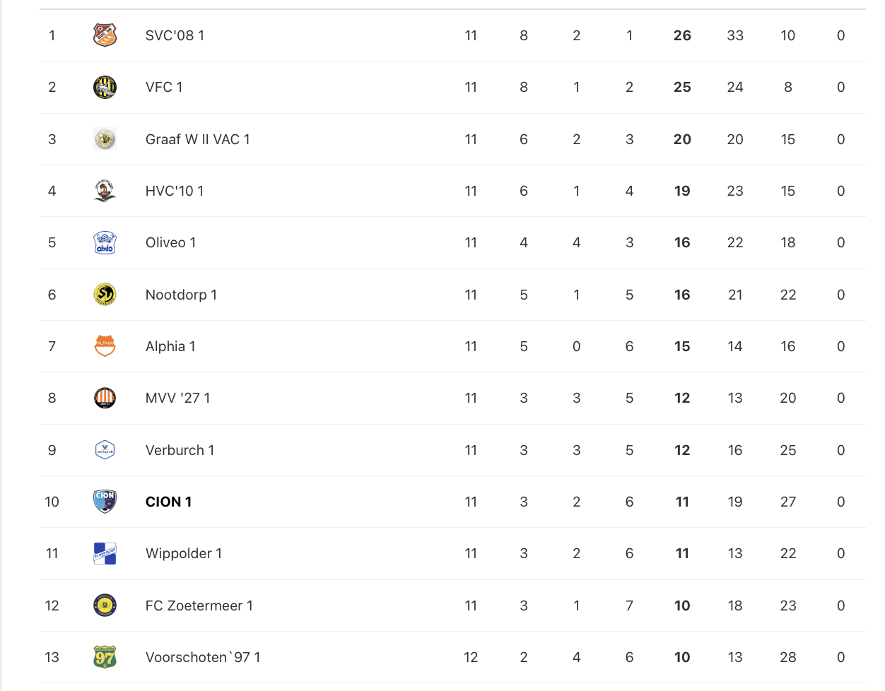 De terugkeer van Toon Wolters bij de Vlaardingers leverde afgelopen zaterdag geen eigenlijk wel verwacht resultaat op, De kwaliteit van het Vlaardingse veld- en samenspel viel tegen en dat zal tegen de moeilijke tegenstander Alphia beter moeten als de overwinning naar Vlaardingen mee moet. De Alphenaren scoren niet veel, maar krijgen ook weinig doelpunten tegen. Het kan een stevige clash worden, want de thuisclub kleunt er vaak stevig in. Resultaat al 25 keer geel. Rechtsback Lars Vuyk moet oppassen om de Alphia-doelman bij corners te hinderen. Mocht CION verliezen, dan is er met twaalf wedstrijden voor de boeg nog geen kind overboord, want Voorschoten’97 kan door de extra vrije dag geen punten sprokkelen en Wippolder en FC Zoetermeer zullen beide niet winnen. Orlando Duivesteiin moet als scheidsrechter wel zijn dag hebben in deze wedstrijd.