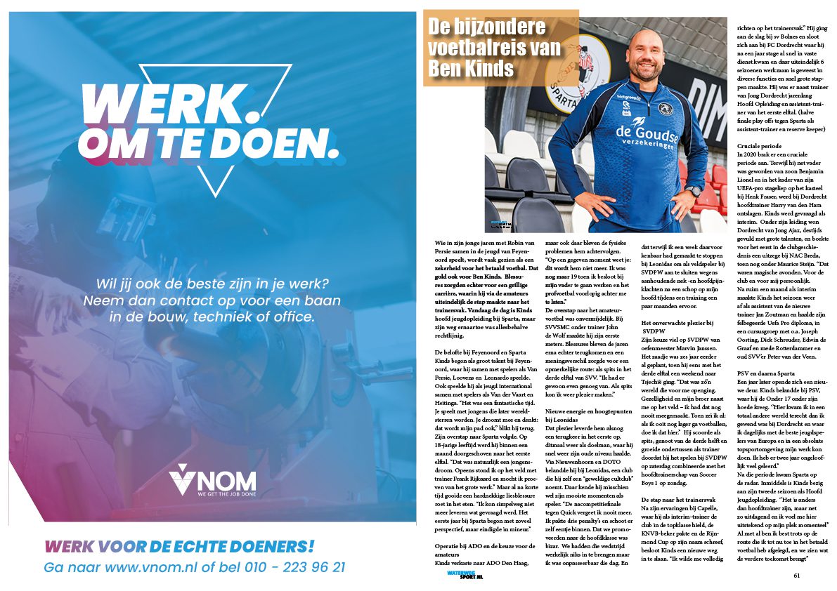 Wie in zijn jonge jaren met Robin van Persie samen in de jeugd van Feyenoord speelt, wordt vaak gezien als een zekerheid voor het betaald voetbal. Dat gold ook voor Ben Kinds. Blessures zorgden echter voor een grillige carrière, waarin hij via de amateurs uiteindelijk de stap maakte naar het trainersvak. Vandaag de dag is Kinds hoofd jeugdopleiding bij Sparta, maar zijn weg ernaartoe was allesbehalve rechtlijnig.