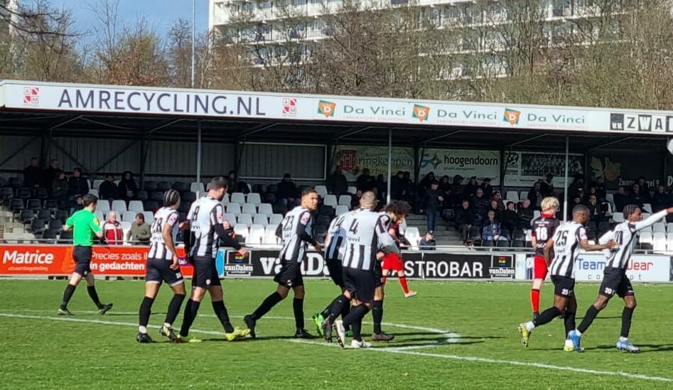 Daarna vloog Zwaluwen weg over de linkerkant…Jazzy Adams gaf na een heerlijke aanval een afgemeten voorzet op Edson Galong die ala Bep Bakhuis de bal snoeihard inkopte! Een verdiende 1-0 voor Zwaluwen in de 22e minuut. De aftrap voor een voetbalgevecht tot minuut 90+7. De eerste helft viel doelpuntenmaker Edson Galong nog uit en viel Maily Lopez in, maar bleef het 1-0.