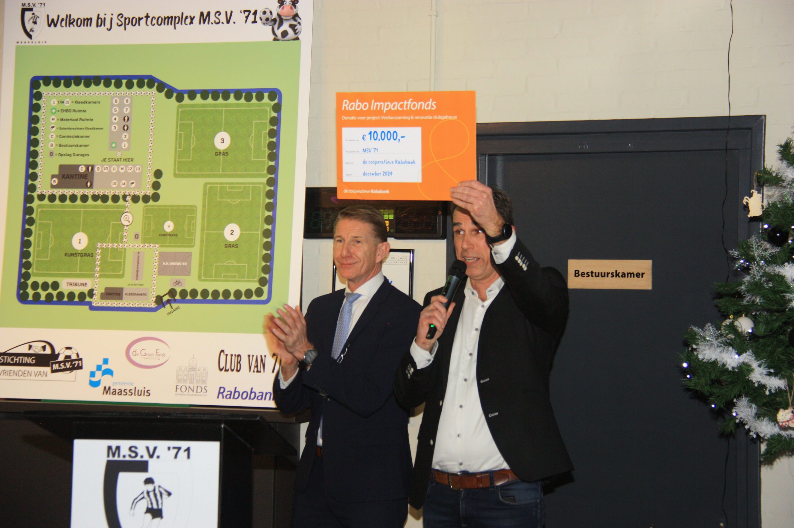 Om het ‘meer jaren plan’ symbolisch af te ronden onthulde de burgemeester en de wethouder tezamen met trots een prachtig bord met daarop een plattegrond van het fraaie Sportcomplex M.S.V.’71 anno 2025. Een schitterend visitekaartje voor de gemeente Maassluis en een top prestatie van de zwart/witte club.