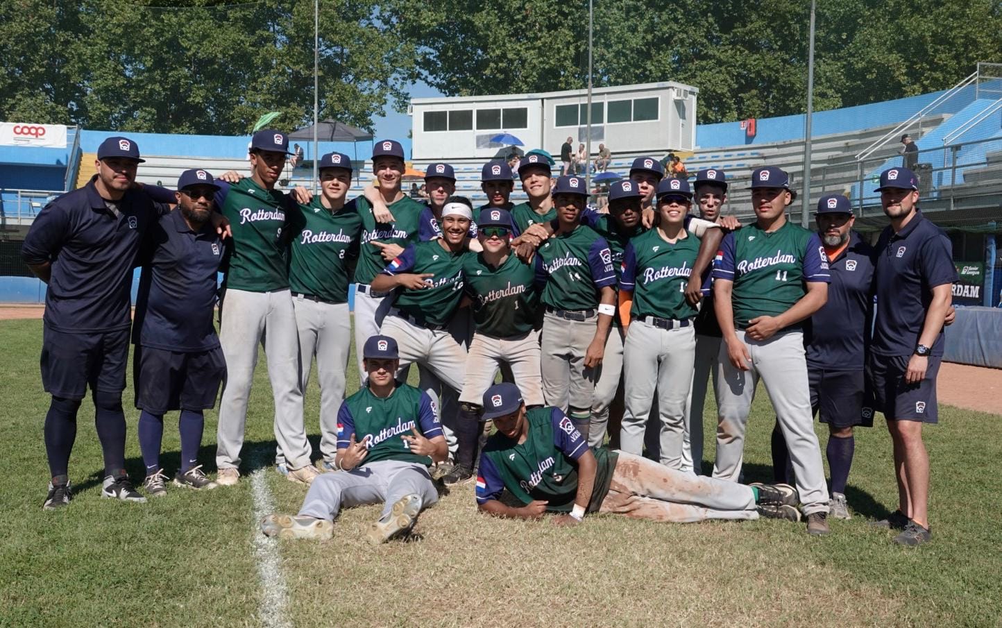 Vanmiddag heeft Team Rotterdam de nare smaak van de eerste twee wedstrijden weggespoeld door Duitsland met een mercy rule overwinning te verslaan. Met een geweldige Tygo van Straten de gehele wedstrijd op de heuvel én met een goed veld achter hem, sloegen de mannen er lekker op los. Ná 6 innings stond met een walk off de eindstand van 10-0 op het scorebord.