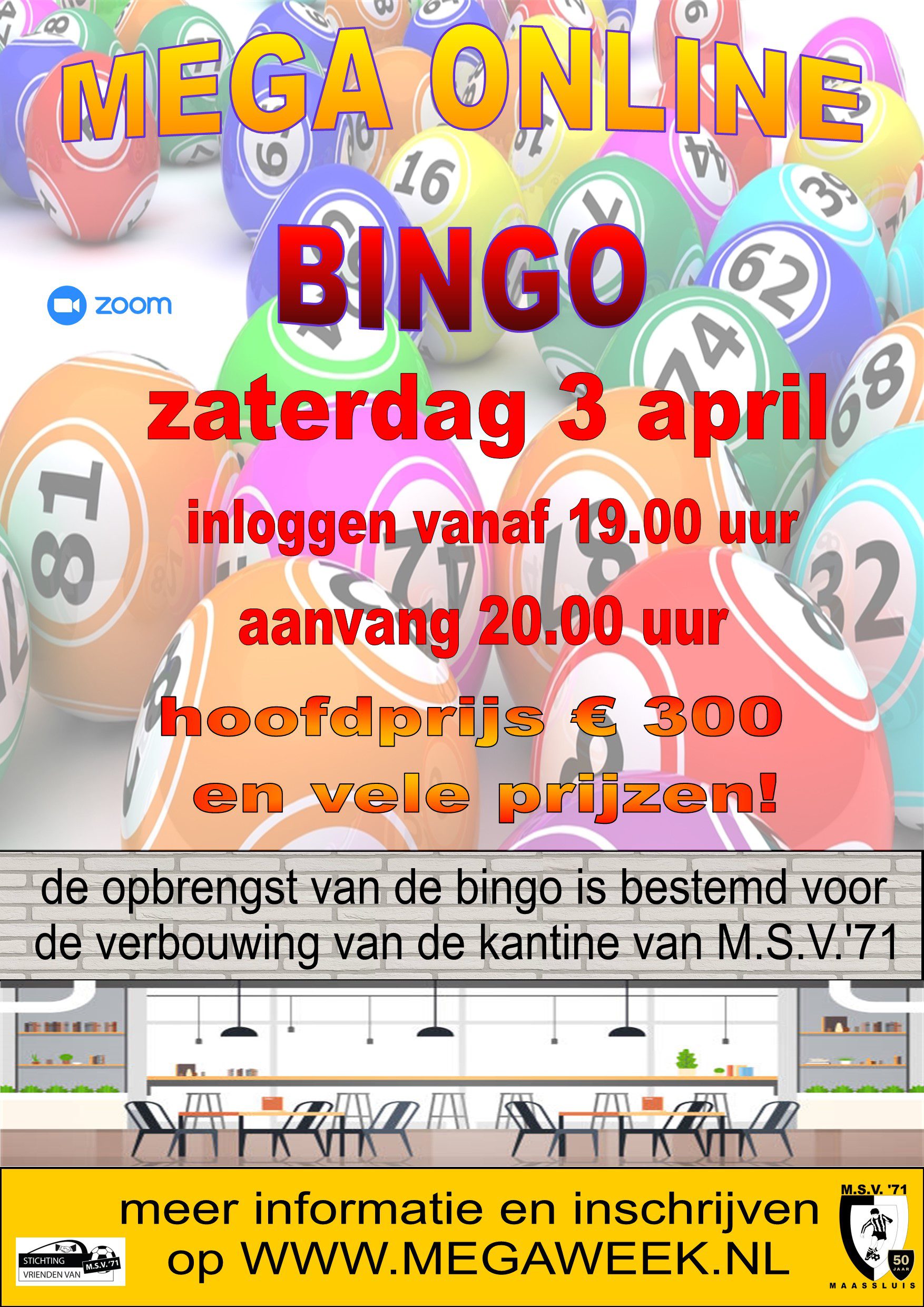 Voetbalvereniging M.S.V.’71 organiseert zaterdag 3 april om 20:00 een Mega Online Bingo met mooie (geld) prijzen! De opbrengst komt ten goede aan de renovatie afronding van onze kantine. De bingo wordt online (via internet) verzorgd door de enthousiaste Megaweek organisatie. Helaas dus niet in de tent maar dit keer gewoon vanuit huis.