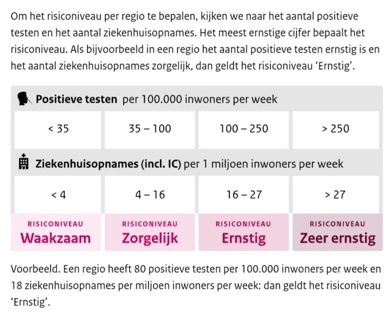 In de regio wordt gehoopt dat er in april, mei en juni nog gespeeld kan worden en de kantines daarbij geopend kunnen worden. Nederland kent vier risiconiveuas waarop eventuele versoepelingen worden gebaseerd: Waakzaam, Zorgelijk, Ernstig en Zeer Ernstig. Momenteel is in Nederland de situtie voor alle regios ‘Zeer ernstig’ Onderstaand een overzicht van mogelijkheden die bij elk risiconiveau passen. Daarbij wordt uitgegaan van het feit dat Nederland 17,28 miljoen inwoners heeft.